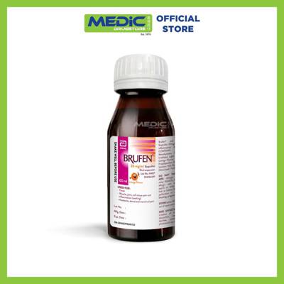 Ingredient(s): Each 5 ml contains: Ibuprofen : 100 mg In an orange flavoured syrup base Indications: Brufen suspension exhibits antipyretic, analegesic and anti inflammatory, properties with a good safety profile. It is therefore indicated in pyrexia associated with upper respiratory tract infections and other disorders. Juvenile rheumatoid arthritis soft tissue inflammation, traumatic inflammation, non specific aches.