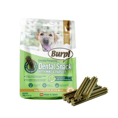 This Burp! Everyday Pamper Dental Snack is a tasty treat that helps to maintain fresh breath and oral hygiene in dogs! The treat is formulated with Sodium Hexametaphosphate to prevent tartar formation. It also contains fish oil and biotin for skin and coat care, with added vitamin D3 and calcium that helps to strengthen the teeth. - Fresh breath with mint and parsley. - Low fat and no added sugar.