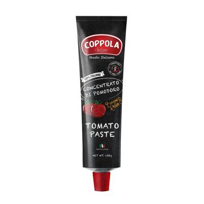 Coppola Tomato Paste made with sun-ripened 100% Italian tomatoes and no salt added. Tomatoes cooked and concentrated at low temperature into a paste with an intense and fresh tomato flavour. Ideal to use as is to add rich flavour and body to any dish. 100% Italian tomatoes, grown and packed in sunny Southern Italy. Single concentrated for the fresh taste of ripe tomatoes. Just tomatoes, nothing else. Conveniently packed in resealablealuminium tubes.