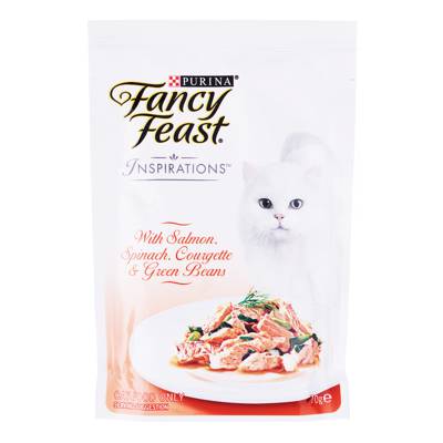 Fancy Feast Inspirations range is a delectable way to add texture to your cat's daily meals. The sultry taste of salmon with the textures of spinach, courgette and green beans to heighten the culinary experience.