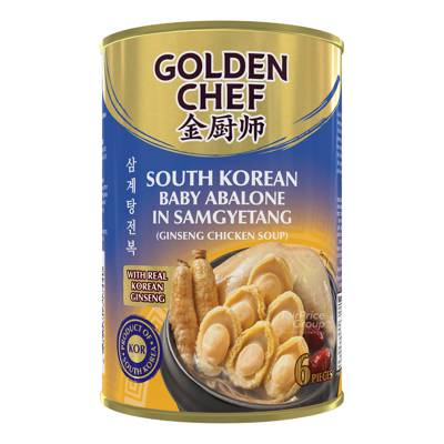 Golden Chef South Korean Baby Abalone In Samgyetang is a traditional Korean ginseng chicken broth infused with whole Korean ginseng roots, and baby abalones harvested from unpolluted pristine waters of Wando at the Southern tip of Korean Peninsula. Enjoy this ready-to-eat delicacy with your family and friends — an elegant blend of tradition, taste and nourishment.