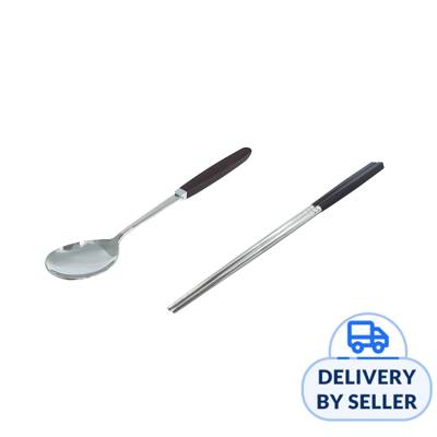 Modern stainless steel spoon and chopstick with brown handle.