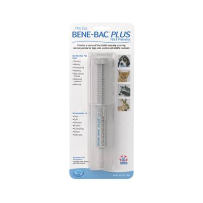 Bene-Bac Plus Pet Gel is a palatable gel in an easy-to-use, 15-gram syringe tube containing concentrated FOS and live, naturally occurring microorganisms. Formulated for pets that are experiencing changes in their diets or environments, and shocks such as: training, travelling, diarrhea, birthing and nursing, newborns orphaned or weaning surgery. Can be taken as a weekly supplement, and is suitable for a wide range of pets and animals such as dogs, cats, hamsters, rabbits, guinea pigs, ferrets, birds, reptiles, equines, and other livestock such as goats, sheep, cattle, and swine. Concentration of 7 beneficial live-culture digestive bacteria, guaranteed 20 Million CFU of viable bacteria per gram. Helps crowd out harmful intestinal organisms, easily digested for instant energy. Platable gel, easy to use. Suitable for dogs, cats, hamsters, rabbits, guinea pigs and other pets